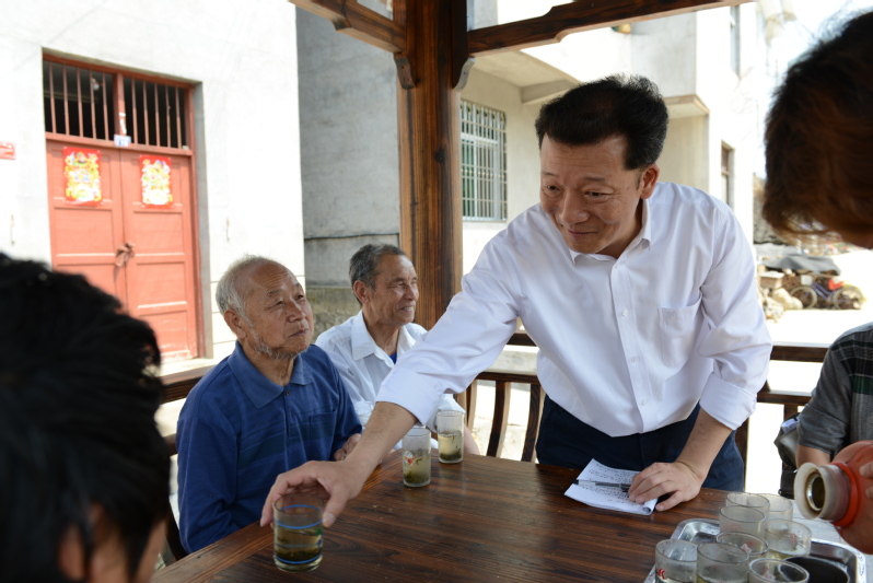 廖俊波在政和县铁山镇东涧村调研,与村民座谈,给老人递上茶水