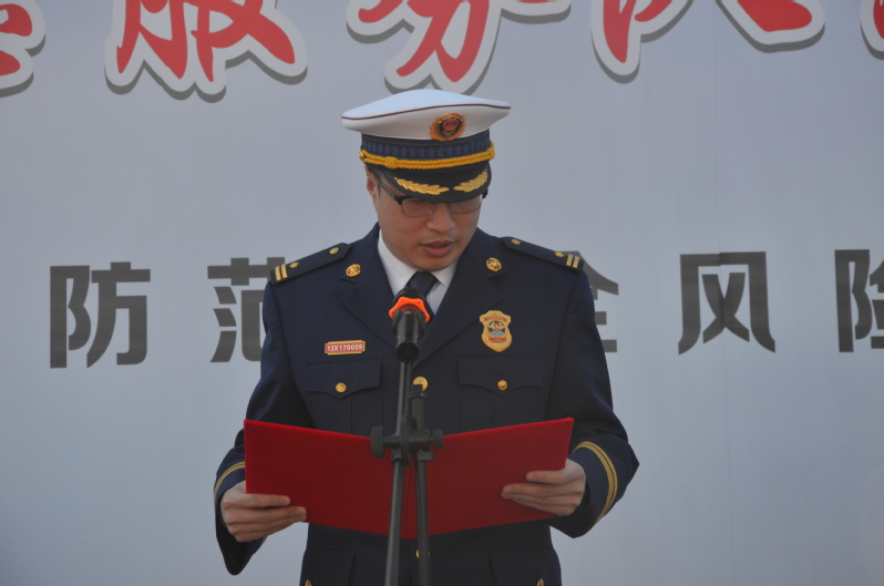 左文祥向消防志愿服务队队长授旗。消防志愿服务队队长带领全体消防志愿者面向队旗庄严宣誓。
