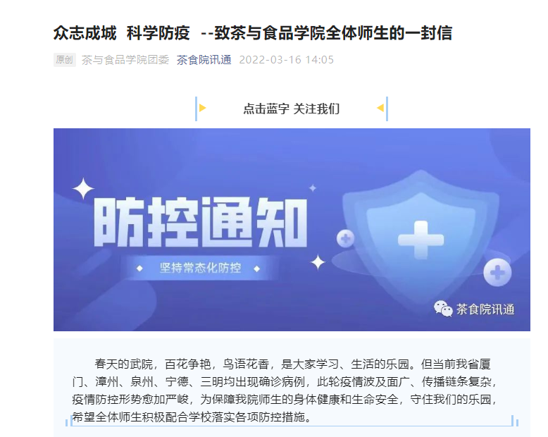 3月11日下午,院党委书记施晓莉组织召开全院教职工大会,传达学校疫情防控工作部署会议精神,并就做好学院疫情防控工作提出了具体部署要求。16日上午,学院党委发布《致茶与食品学院全体师生的一封信》,号召全体师生做科学防控的示范者、做群防群控的践行者、做理性防控的引导者,在全体师生中引起热烈反响。18日,院党委召开党委(扩大)会议,专题研究推进疫情防控相关工作。19日下午,院党委组织召开疫情防控知识教育宣讲视频会,切实提升我院疫情防控应急处置能力和水平,保障师生员工生命安全和身体健康。