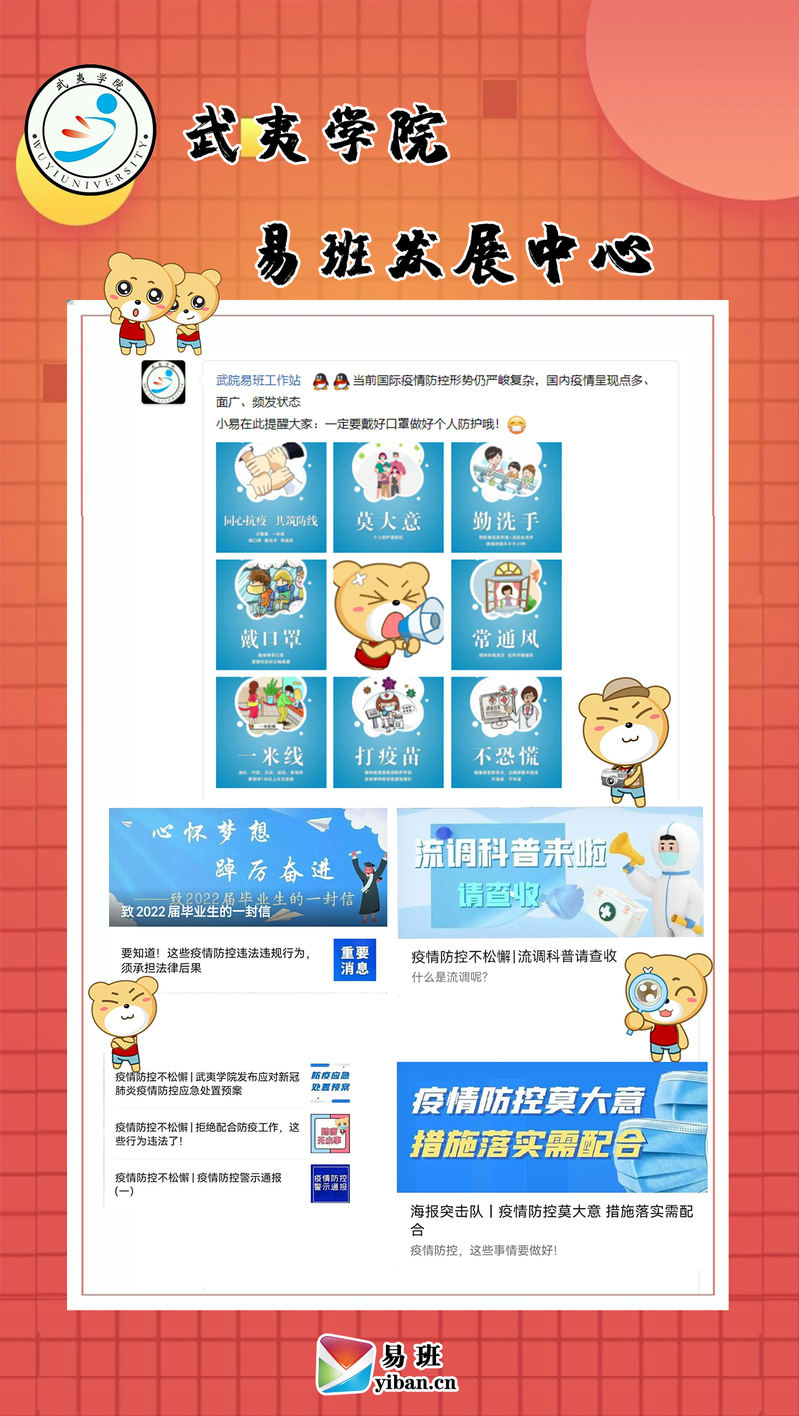 利用易班网、“武夷学院易班工作站”微信公众号、“武院易班工作站”QQ空间公众号三大主要平台,第一时间开展宣传引导,结合学校实际情况及疫情防控政策,撰写《疫情防控莫松懈,同学们都注意啦》、《心怀梦想 踔力奋进——致毕业生的一封信》,绘制包含武夷学院元素的疫情防控政策宣传系列海报,开设《疫情防控不松懈》专栏转发系列科普推文,着重介绍学校最新防疫政策及应急处置预案,同时加强防控法律法规及违法案例宣传警示。
