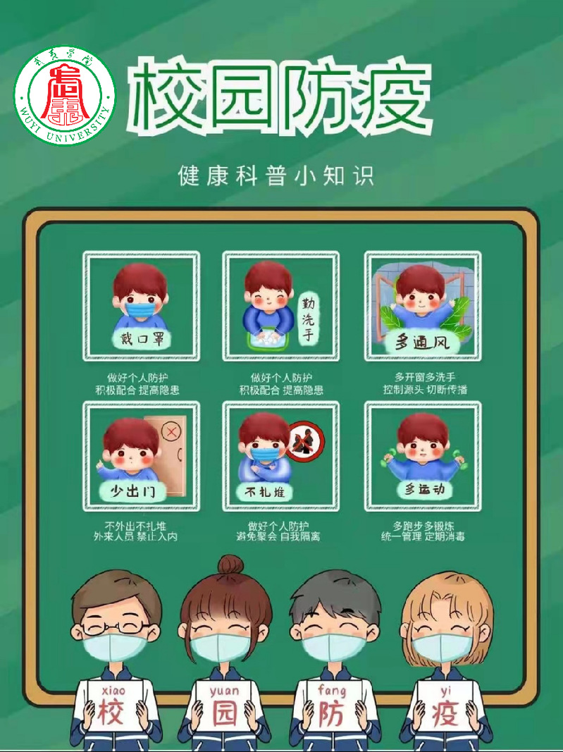 一是周密部署防控工作。先后召开七次专题会议安排部署后勤服务保障工作,落实相关疫情防控要求。会议要求全体人员提高思想认识,持续绷紧疫情防控这根弦,做到人、物、环境同防,行动要快、措施要严、工作要实、落实要细,齐心协力做好疫情防控各项工作。会议对饮食保障、人员管理、宿舍管理、快递物流、卫生环境消杀等相关疫情防控工作进行多次再研究、再部署。同时进一步完善疫情防控工作方案(《武夷学院传染病防控健康教育制度》《武夷学院新型冠状病毒肺炎疫情防控及突发公共卫生事件报告制度》《武夷学院疫情防控期间校园环境通风消毒制度》《武夷学院疫情防控期间校园环境卫生的管理与通报制度》《武夷学院应急接种制度》),补充制定了《武夷学院后勤保障工作方案及应急处置预案》和《武夷学院食堂冷链食品管理暂行办法》,切实抓好疫情防控相关工作。