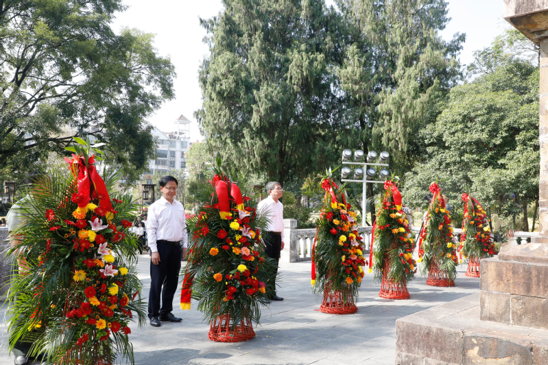 校党委书记庄祥生与武夷山市四套班子主要领导、人武部领导登上纪念碑基座,上前整理花篮缎带。随后,参加仪式的全体人员怀着崇敬的心情,共同瞻仰革命烈士纪念碑,向革命先烈致以最崇高的敬意。