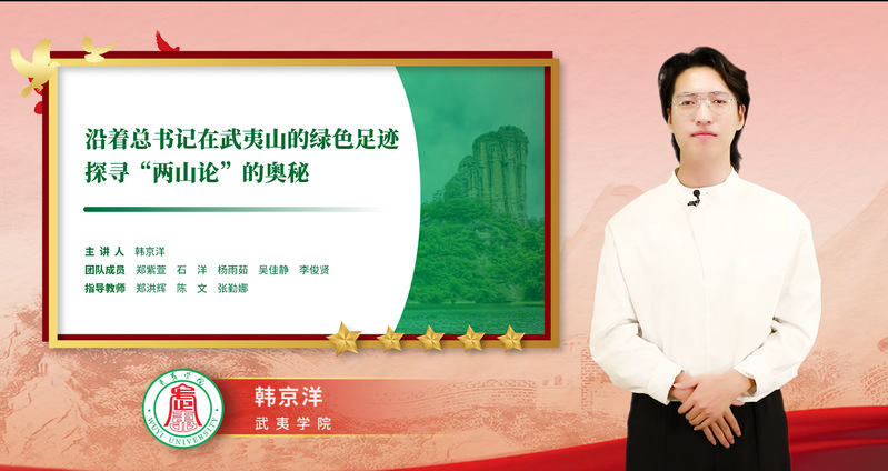近日,由教育部高校思想政治理论课教学指导委员会主办的习近平新时代中国特色社会主义思想大学习领航计划系列活动之“青春献礼二十大·强国有我新征程”——第六届全国高校大学生讲思政课获奖名单揭晓。由我校郑洪辉、陈文、张勤娜等老师指导的韩京洋团队作品《沿着总书记在武夷山的绿色足迹,探寻“两山论”的奥秘》在本次比赛中荣获优秀奖。