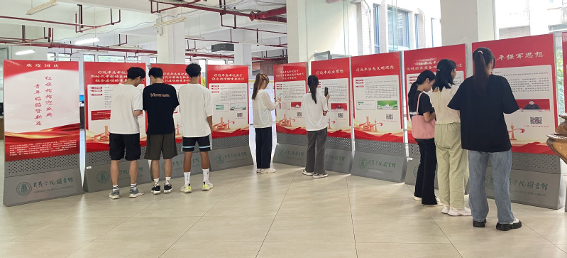 其中,习近平新时代中国特色社会主义思想著作专柜展出《习近平著作选读》《习近平谈治国理政》《习近平新时代中国特色社会主义思想三十讲》等相关著作,集中展示新时代中国共产党的思想成果,传播正能量,激发大学生学习新思想的热情,厚植红色情怀;中华传统文化专柜的设置旨在传承经典、活化馆藏,展现中华传统文化的魅力,展出时间跨度由先秦至清末的百部国学经典,如《诗经》《周易》《礼记》《尚书》《论语》《楚辞》《人间词话》等;“学习新思想 ‘码’上思政课——思政专家课程扫码视听图片展览”,以图片的形式展出中共中央党校、外交学院、中国人民解放军军事科学院等院校12位专家的思政专题讲座,内容涵盖习近平强军思想、习近平生态文明思想以及习近平总书记关于社会治理、文化建设、总体国家安全观等方面的重要论述,读者只需扫码,即可聆听讲座内容。