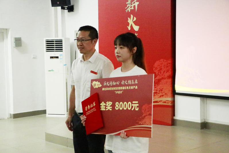 闽北革命历史纪念馆馆长崔雷明为“IP设计”金奖获得者叶雅洁同学颁奖
