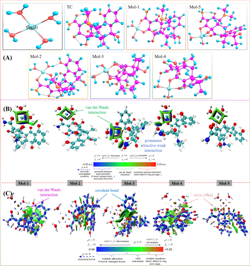 图2 铜络合物的演化和构型(A)、IGMH(B)和IRI(C)