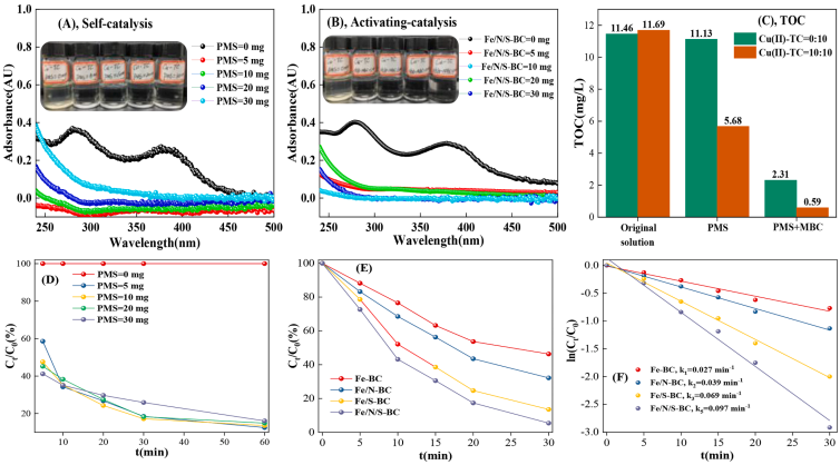 图3 紫外可见光谱(A-B),TOC含量(C),降解动力学(D、E)和拟一级模型拟合(F)