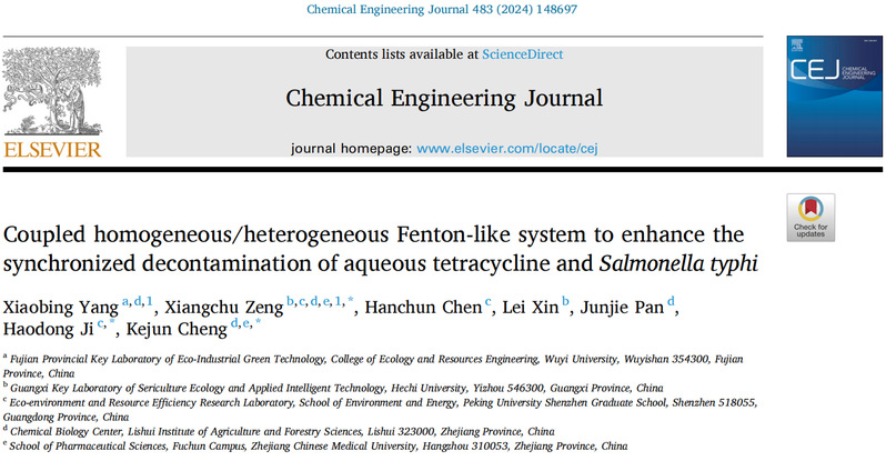 针对以上问题,我校生态与资源工程学院杨小炳博士和北京大学深圳研究生院曾湘楚博士、冀豪栋研究员以及丽水农林科学院程科军研究员合作,利用甘蔗渣为原料,制备了硫-氮共掺杂的铁基磁性生物碳复合材料(简称Fe/N/S-BC),实现了对四环素和伤寒沙门氏菌的有效处理。该成果以《Coupled homogeneous/heterogeneous Fenton-like system to enhance the synchronized decontamination of aqueous tetracycline and Salmonella typhi》为题,发表在《Chemical Engineering Journal》期刊上(该期刊是工程技术与化学化工领域最有影响力的顶级刊物之一,中国科学院分区为工程技术/化学/环境类1区Top期刊,最新影响因子为15.1),杨小炳博士为第一作者,武夷学院为第一单位。