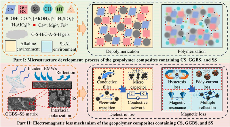 水泥生产过程能耗高、碳排放量大,而工业固废的堆积也带来严峻环境压力。因此,工业固废的高值化转化已成为推动建筑业绿色低碳转型的关键课题。本研究以电石渣、矿渣和钢渣为原料,构建了一种无需水泥熟料的全固废胶凝体系,实现了“以废治废”和资源循环利用。研究成果表明,通过引入低活性工业固废(钢渣)可有效缓解传统地聚物的体积稳定性问题,实现可控收缩性。在保证力学性能的前提下,这种新型地聚物的另一大亮点在于其优异的电磁波吸收性能。钢渣中富含的铁相成分增强了体系的介电损耗与磁损耗能力,实现了无需外加吸收剂的功能化设计(其水化机理与电磁吸收机制如下图所示)。该新型地聚物在电磁防护、隐身工程、通信基站电磁兼容等领域具有广阔应用前景,可服务于交通设施、数据中心、文化遗产保护等多项基础设施与可持续发展项目。