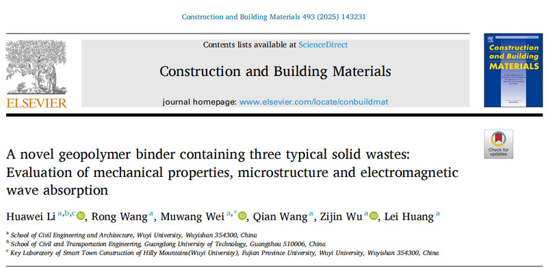 该研究成果以“A novel geopolymer binder containing three typical solid wastes: Evaluation of mechanical properties, microstructure and electromagnetic wave absorption”为题发表在国际权威期刊“Construction and Building Materials”(中科院一区Top期刊,IF=8.0)。武夷学院土木工程与建筑学院李华伟为第一作者,魏木旺为通讯作者,王荣、王倩、吴子瑾和黄蕾为共同作者,武夷学院为第一单位。