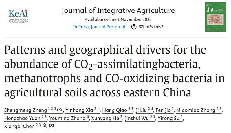 研究成果以“Patterns and geographical drivers for the abundance of CO2-assimilating bacteria, methanotrophs and CO-oxidizing bacteria in agricultural soils across eastern China”为题,发表于农林科学领域国际权威期刊《Journal of Integrative Agriculture》(中国科学院一区TOP,IF=4.4)。郑生猛副教授为论文第一作者,中国科学院亚热带农业生态研究所陈香碧研究员为通讯作者。