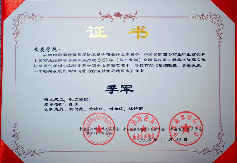 近日,2025年(第十九届)全国高校商业精英挑战赛文旅与会展创新创业实践竞赛全国总决赛精英赛在浙江永康圆满落幕。我校海峡成功学院学子黄思莹、黄欣妍、刘湘婷、林诗雨组成的团队,在指导老师张庆的带领下,凭借新媒体实战营销和作品《星潮赋能、金彩永康——年轻向永康新媒体运营与价值转化总结报告》,荣获旅游目的地新媒体营销赛(永康专项)季军。