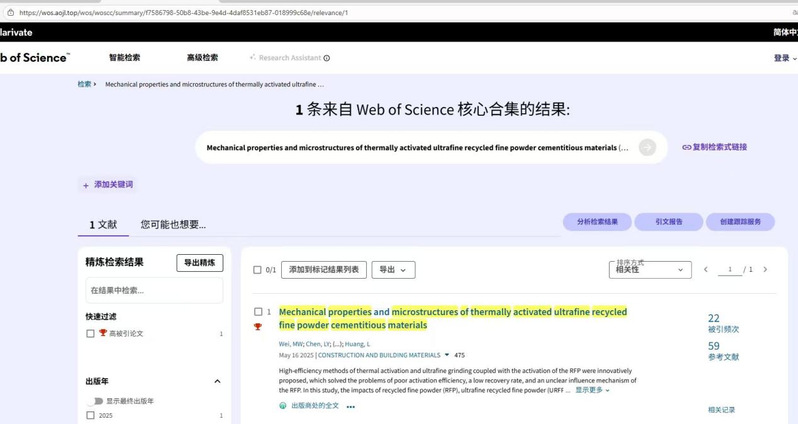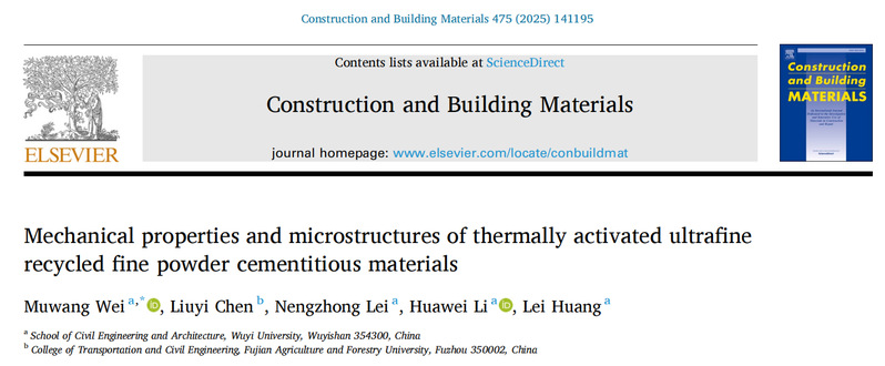 今年初,我校土木工程与建筑学院绿色建筑灾变与耐久性团队在国际建筑材料期刊《Construction and Building Materials》(IF=8.0,中科院一区Top)发表题为“Mechanical properties and microstructures of thermally activated ultrafine recycled fine powder cementitious materials”研究成果。论文发表后引起国际学术界广泛关注并于2025年11月入选ESI全球前1%高被引论文。