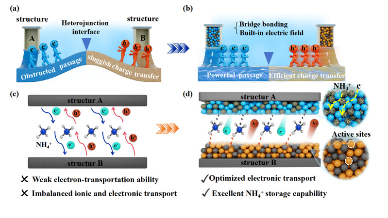 研究团队经过长期系统研究,通过原位表征与理论模拟的手段系统验证了桥键作用和内建电场作用的调控机制,并首次提出了复合电极之间的桥键作用和内建电场作用对铵离子器件电荷转移的影响规律——桥键结构可有效构建稳定的界面电荷转移通道,而内建电场则能通过调控电荷分布,进一步加速电荷分离与转移效率。两者协同作用使铵离子储能器件的容量、循环稳定性等关键性能指标得到大幅提升。这一创新性发现可为新型高效铵离子储能器件的设计与开发提供明确的理论指导。
