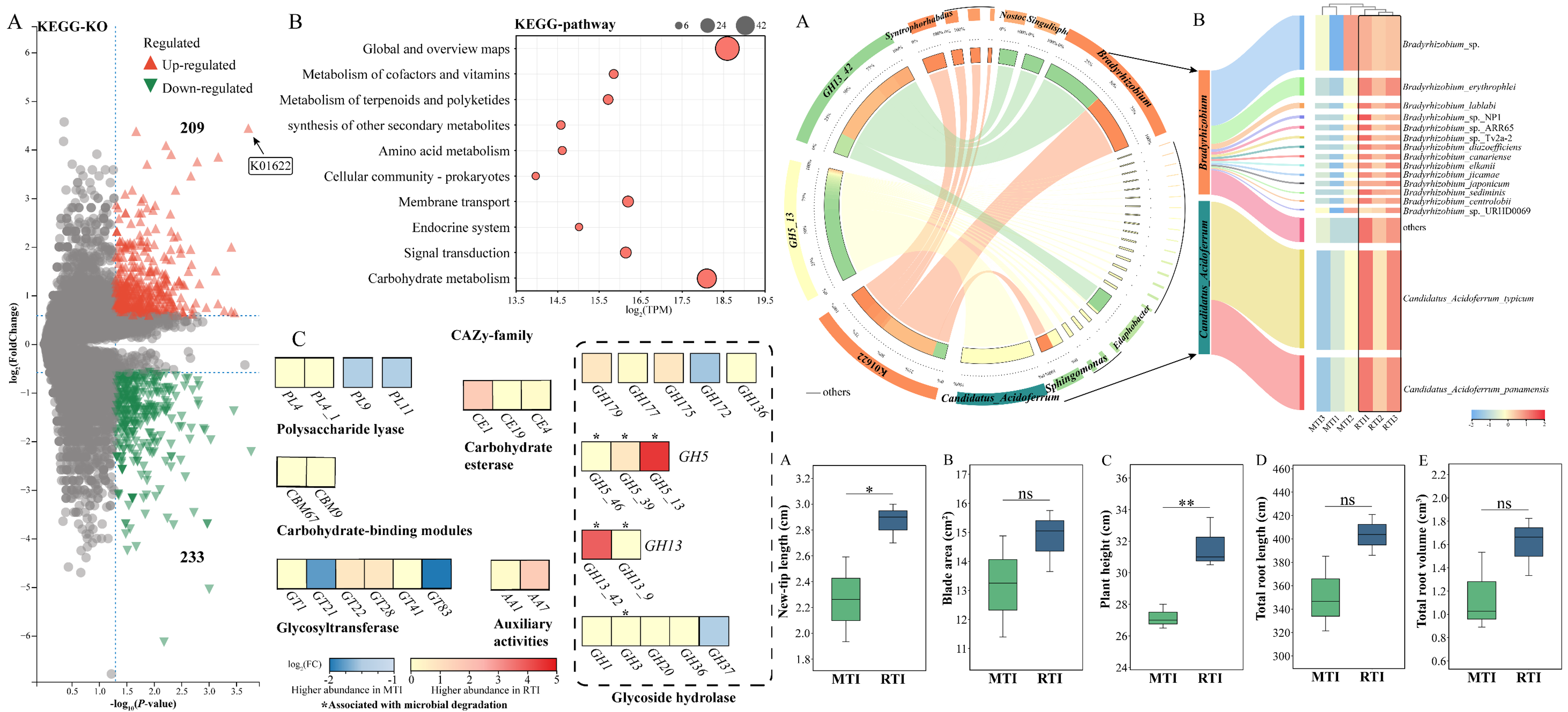 近日,我校茶与食品学院李奇松副教授从根际微生物功能与根系分泌物互作的角度,揭示了茶树/麦冬间作系统促进茶树生长的微生态机制:间作显著提高了根系分泌物中特异有机酸(如组氨酸、丝氨酸、亮氨酸等氨基酸)的含量,招募并富集了具有有机物降解能力的功能微生物(如Bradyrhizobium和Candidatus_Acidoferrum是间作系统中富集功能基因K01622和GH5_13的主要贡献者),增强了土壤养分循环能力,从而促进茶树生长。该研究为缓解茶园连作障碍、推动茶园生态可持续发展提供了理论依据与技术支撑。