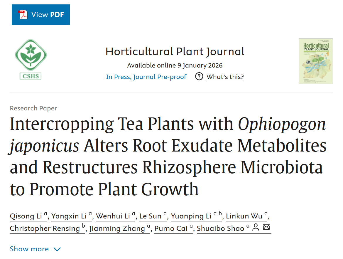 该研究成果以“Intercropping Tea Plants with Ophiopogon japonicus Alters Root Exudate Metabolites and Restructures Rhizosphere Microbiota to Promote Plant Growth”为题在线发表在《Horticultural Plant Journal》(中科院一区Top期刊,IF=6.2)。李奇松副教授为第一作者,武夷学院茶与食品学院为第一完成单位。