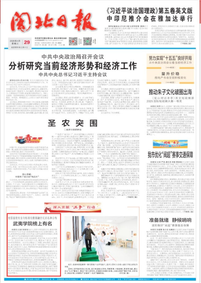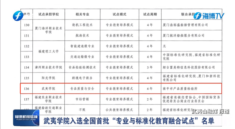 市场监管总局、教育部近日联合印发了《关于公布专业与标准化教育融合试点名单的通知》,全国共281个试点项目入选。福建电视台“福建新闻联播”、闽北日报分别对我校食品质量与安全专业入选名单进行关注报道。