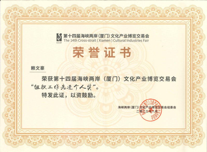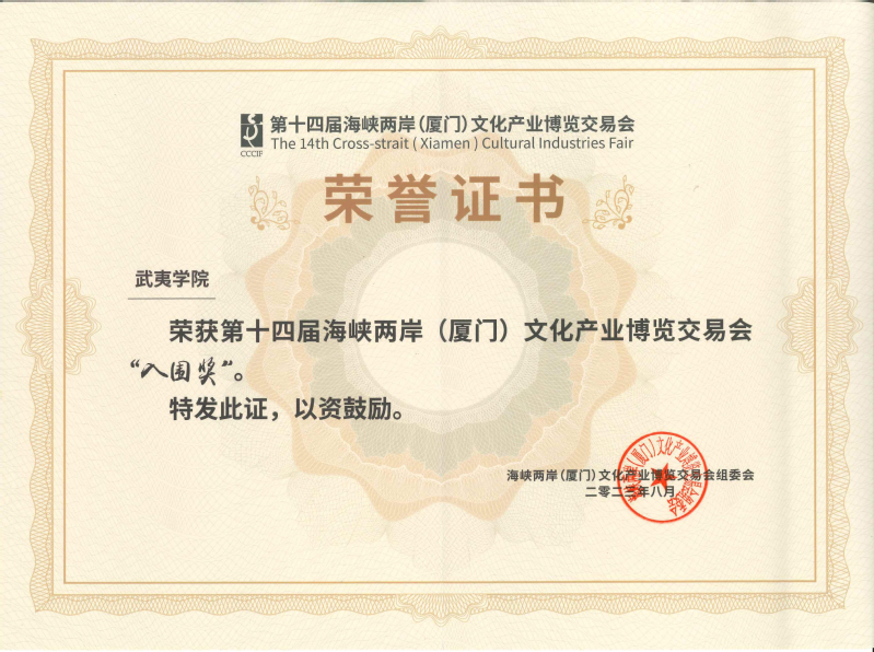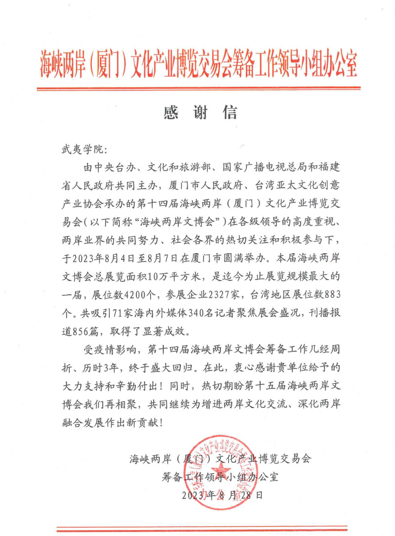 日前,海峡两岸文化产业博览交易会组委会向我校发来感谢信,对我校在第十四届海峡两岸(厦门)文化产业博览交易会工作中的高度重视和积极参与,以及筹备工作因受疫情影响几经周折、历时3年期间给予的大力支持和辛勤付出表示衷心感谢,热切期盼共同继续为增进两岸文化交流、深化两岸融合发展作出新贡献。同时,授予我校本届海峡两岸文博会“组织奖”和“入围奖”,授予赖文豪同志“组织工作先进个人奖”。