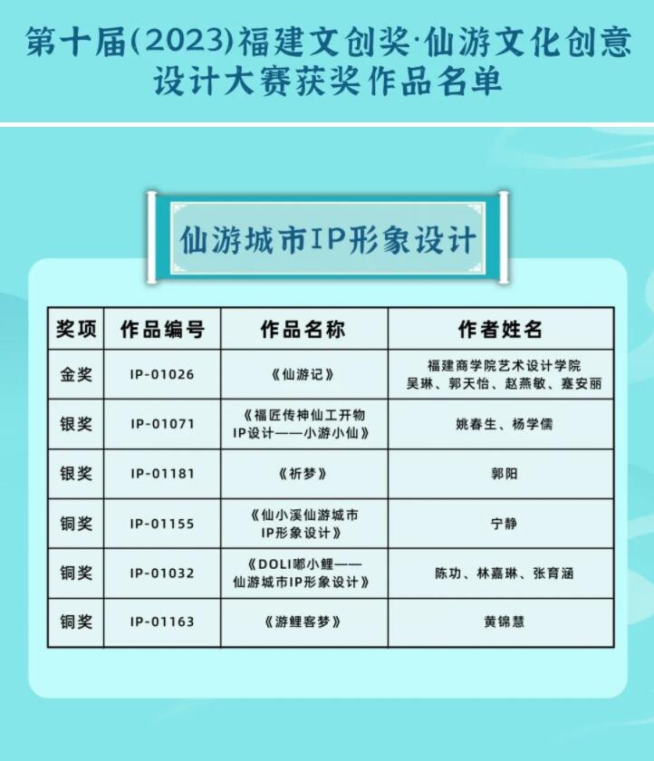 日前,由福建省委宣传部、省台港澳办、省发改委、省工信厅、省教育厅、省科技厅、省文旅厅、省广电局指导莆田市委宣传部、仙游县委、仙游县政府主办第十届(2023)福建文创奖·仙游文化创意设计大赛评选结果正式揭晓。我校艺术学院2021级视觉传达设计郭阳同学的作品《祈梦》荣获“仙游城市IP形象设计”银奖(指导老师:魏攀)。
