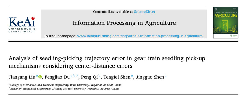 我校机电工程学院刘建刚博士瞄准闽北蔬菜产业对机械化移栽的迫切需求,为进一步提高蔬菜移栽机的作业效率和成功率,系统分析了非圆完全齿轮行星轮系取苗机构的运动学特性,揭示了中心距误差对高效取苗稳定性的影响机制。所研制的蔬菜自动移栽机的核心部件——非圆完全齿轮行星轮系取苗机构可实现蔬菜移栽取苗完全自动化,取苗成功率达95%,作业效率高达90株/分钟/行。研究成果以“Analysis of Seedling-picking Trajectory Error in Gear Train Seedling Pick-Up Mechanisms Considering Center-distance Errors”为题,在国际权威期刊《Information Processing in Agriculture》(中科院一区Top,IF=7.4)上发表,刘建刚博士为第一作者,武夷学院为第一完成单位。