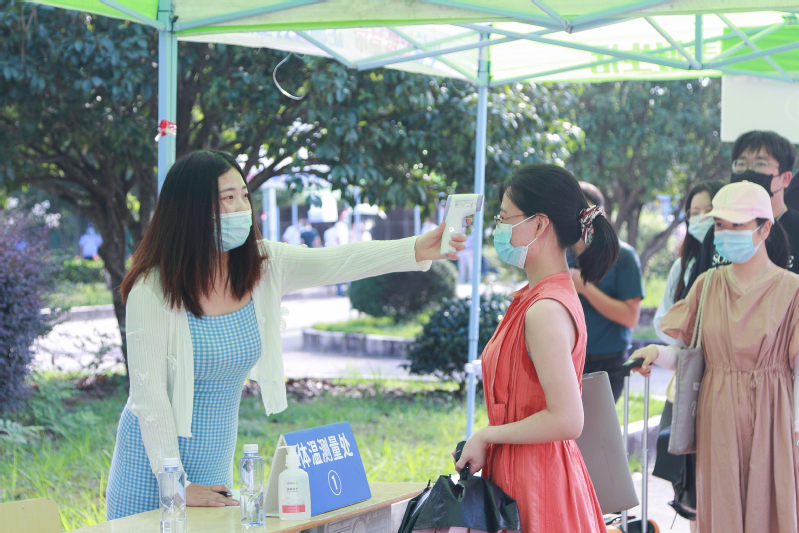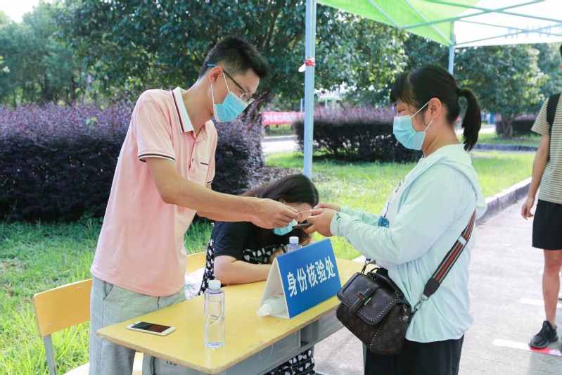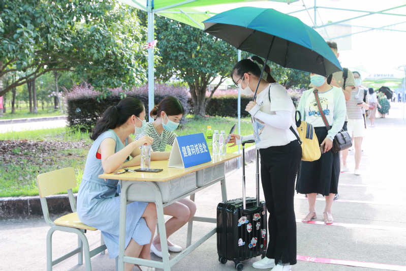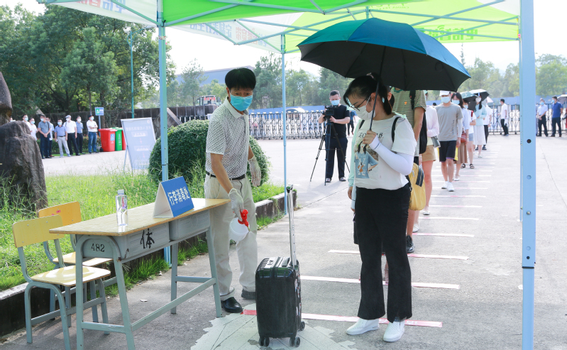 在演练现场,“学生”有序排队分别经过体温测量处、身份核验处、健康码核验处、行李箱消毒处,并按照划定路线返回宿舍楼。演练现场分别设置返校报到现场出现体温异常的学生、在报到现场身份核验区出现未带证件的学生、健康码为“黄码”的返校学生、乘坐私家车返校学生等四个场景,模拟了学生返校入校身份验证、健康检测以及突发情况应急处置等情况。