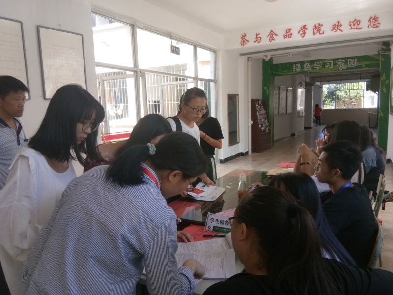 茶与食品学院团总支学生会干部从早上七点半到晚上九点轮流在宿舍楼下值班,高效而有序的为新生办理入学手续。