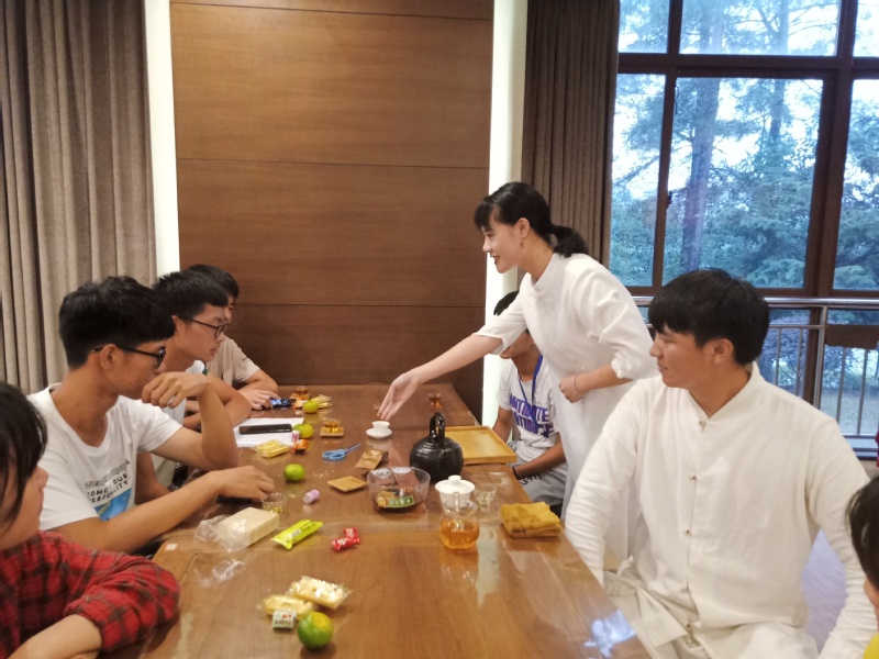 现场,同学们欢笑畅谈,其乐融融,共同欣赏了由我院茶艺队展示的优美茶艺表演,一起唱歌,喝茶,亲自体验泡茶的乐趣。2019级辅导员张环纬老师与同学们一起亲切地交流,并体验了泡茶的艺术。同时雷卫星老师也转达院领导以及全体老师对同学们的问候,并致予最真挚的节日祝福。