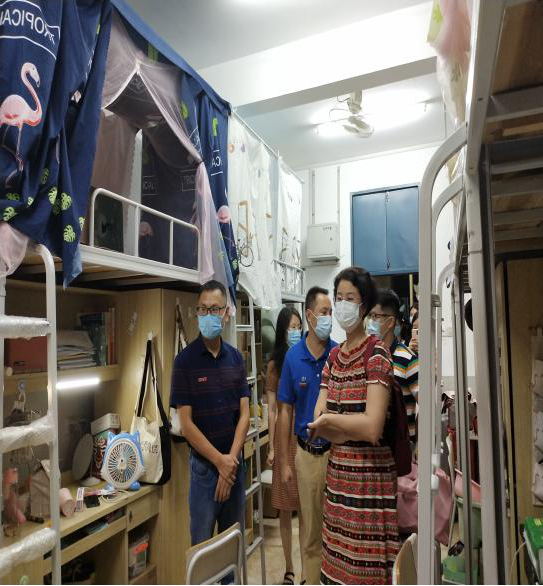 学生返校当晚,施晓莉书记一行深入学生宿舍,了解返校学生的生活学习情况,慰问返校同学并与他们贴心交流,鼓励大家克服疫情所带来的困难,保持良好的心态和身体状况。叮嘱同学们做好宿舍内务整理,勤开窗、多通风,注意个人安全防护,遵守学校相关管理制度,认真抓好学习不松懈。