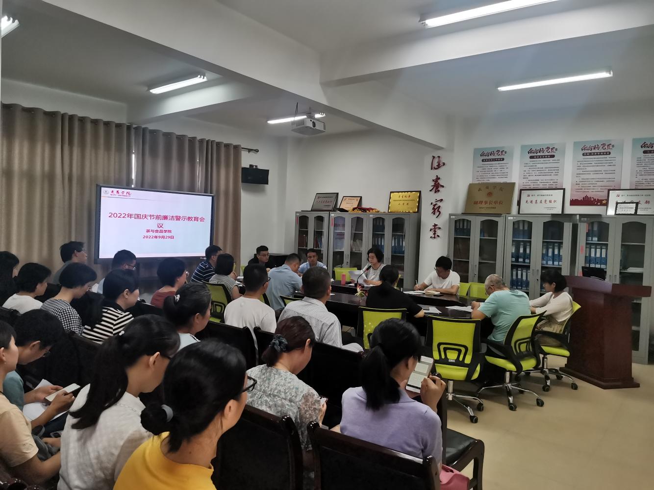 9月29日下午,院党委书记施晓莉组织召开国庆节前廉洁警示教育会议,院党委副书记林有鸿、院党委纪检委员、圣农食品学院副院长范俐、各系各部门负责人、全体行政人员及教师代表参加会议。
