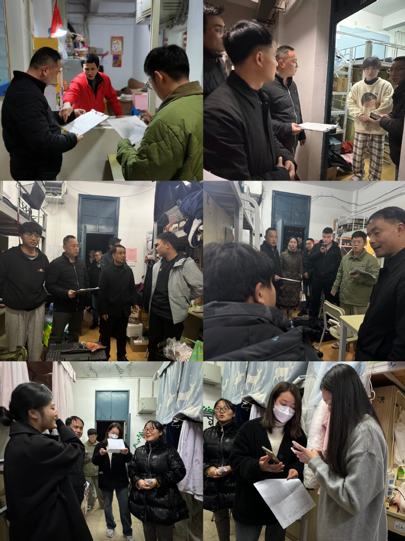 此外,1月16日,院党委副书记林有鸿带领班主任、学工科全体成员以及楼长,深入学生宿舍开展假期安全隐患排查、比对学生离校信息等相关工作。提醒学生要注意宿舍用水用电安全、食品安全、交通安全、个人财产安全等,不燃放烟花爆竹等易燃、易爆的危险物品。对于近期是电信诈骗和网络诈骗高发期,提醒同学们要时刻保持冷静、警觉和理智。留校期间保证不酗酒、赌博、聚众喧哗,及时向家长等直系亲属报告在校的情况。离校外出时,自觉关好门窗、关闭水电开关,将电源插头拔下。