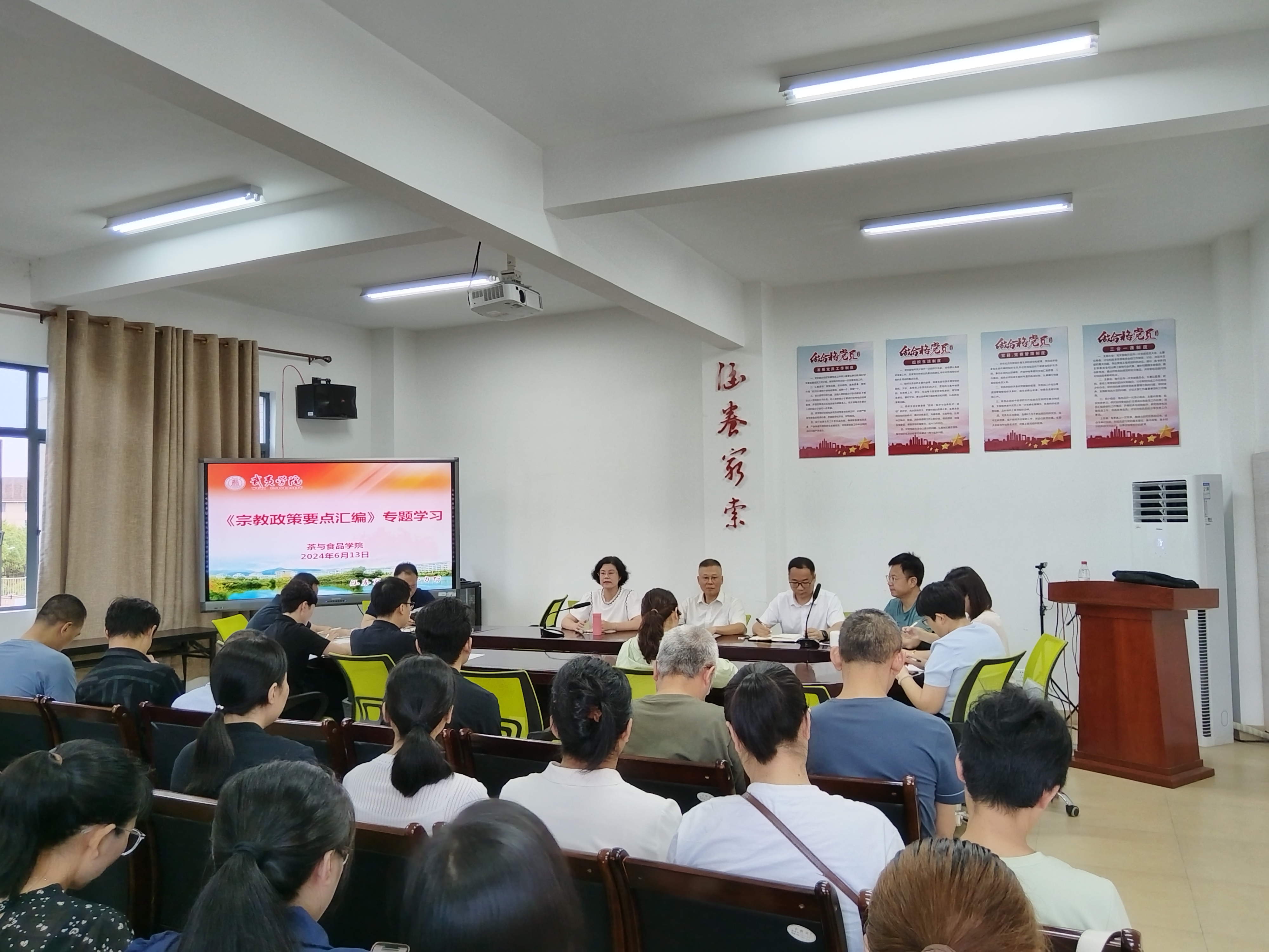 6月13日,我院召开宗教政策法规宣传学习培训会,会议由院党委书记施晓莉主持,院党委委员、各系、各科室负责人、各年级辅导员、全体教职员工参加会议。