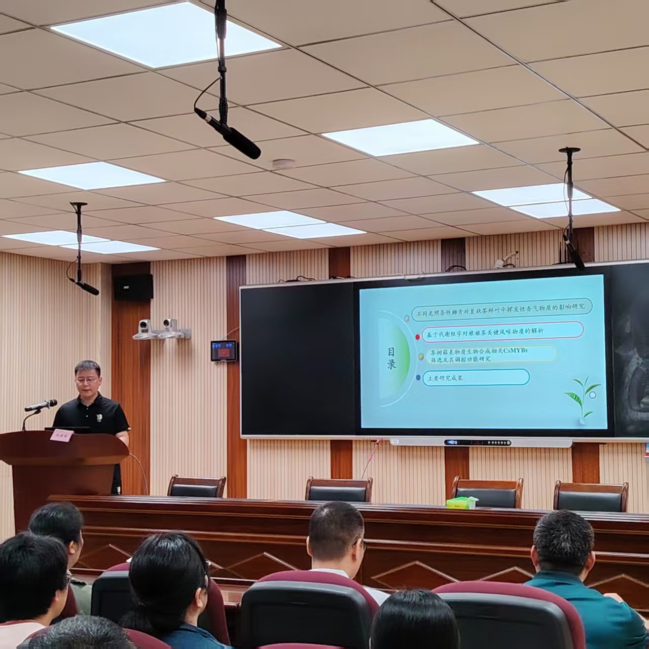 为促进学术交流,拓展科研视野,提升茶学科以及农业学科硕士点建设能力,5 月 21 日上午 9 点,贵州大学茶学院院长刘建军教授受邀,在屏13教师多功能会议室,以《绿茶香气品质形成机理与转录调控研究》为题,为学院师生带来一场前沿学术讲座。此次讲座由叶江华院长主持,现场座无虚席,现场学术氛围浓厚。