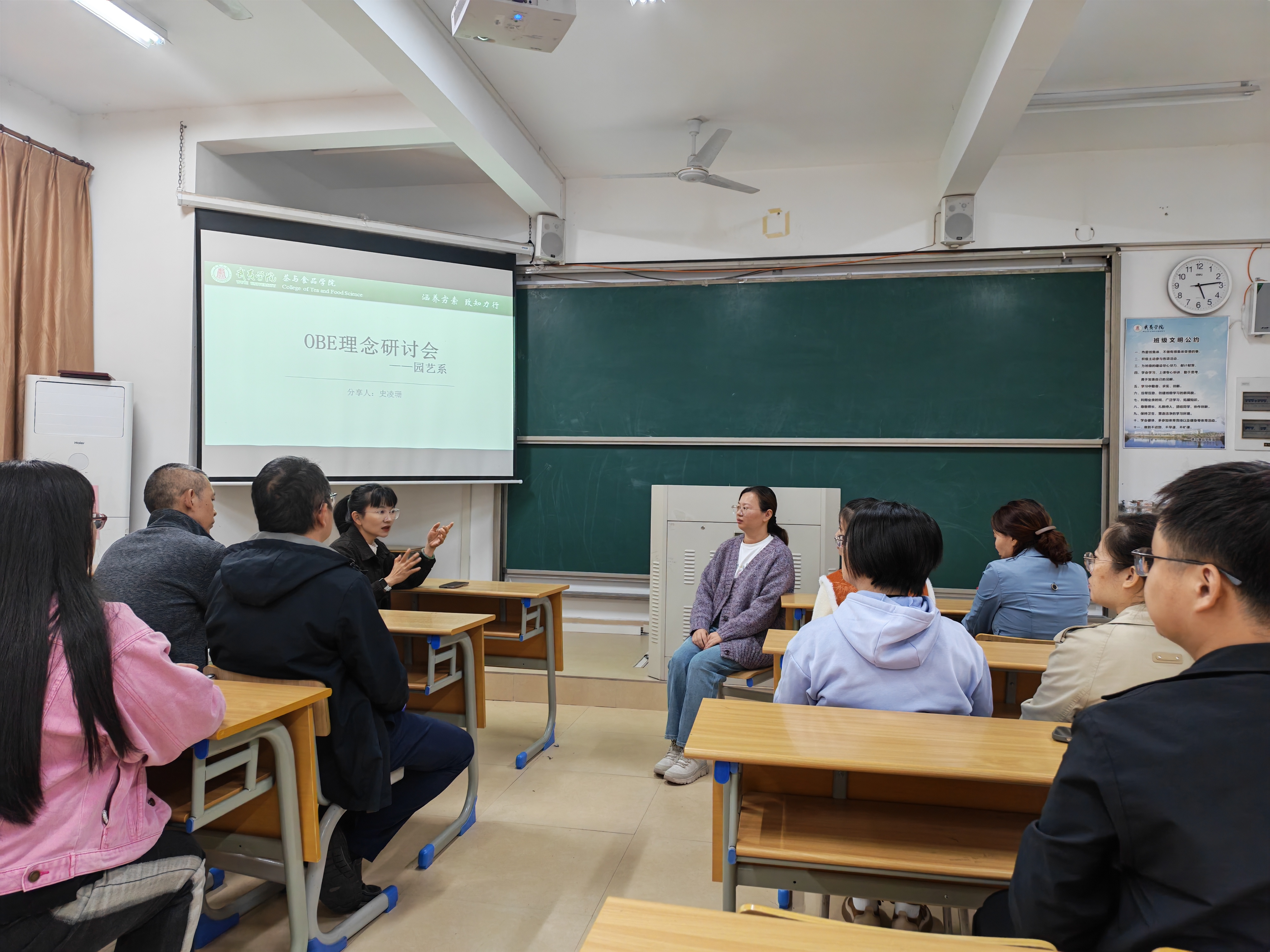 研讨会由园艺教研室主任史凌珊老师主讲。她首先深度阐释OBE“以学生为中心、以学习成果为导向”的核心内涵,明确教育需先锚定学生毕业时应具备的核心能力目标,再反向设计教学内容、正向推进教学过程,确保人才培养的精准性与有效性。随后,史老师通过对比传统教育与OBE模式的本质差异,清晰梳理出“从关注‘教师教什么’到聚焦‘学生学会什么’”的教育范式转变;并系统介绍了园艺系实施OBE的四大关键环节——定义学习成果、实现学习成果、评估学习成果、运用评估结果,构建起“评估-反馈-改进”的人才培养质量闭环。