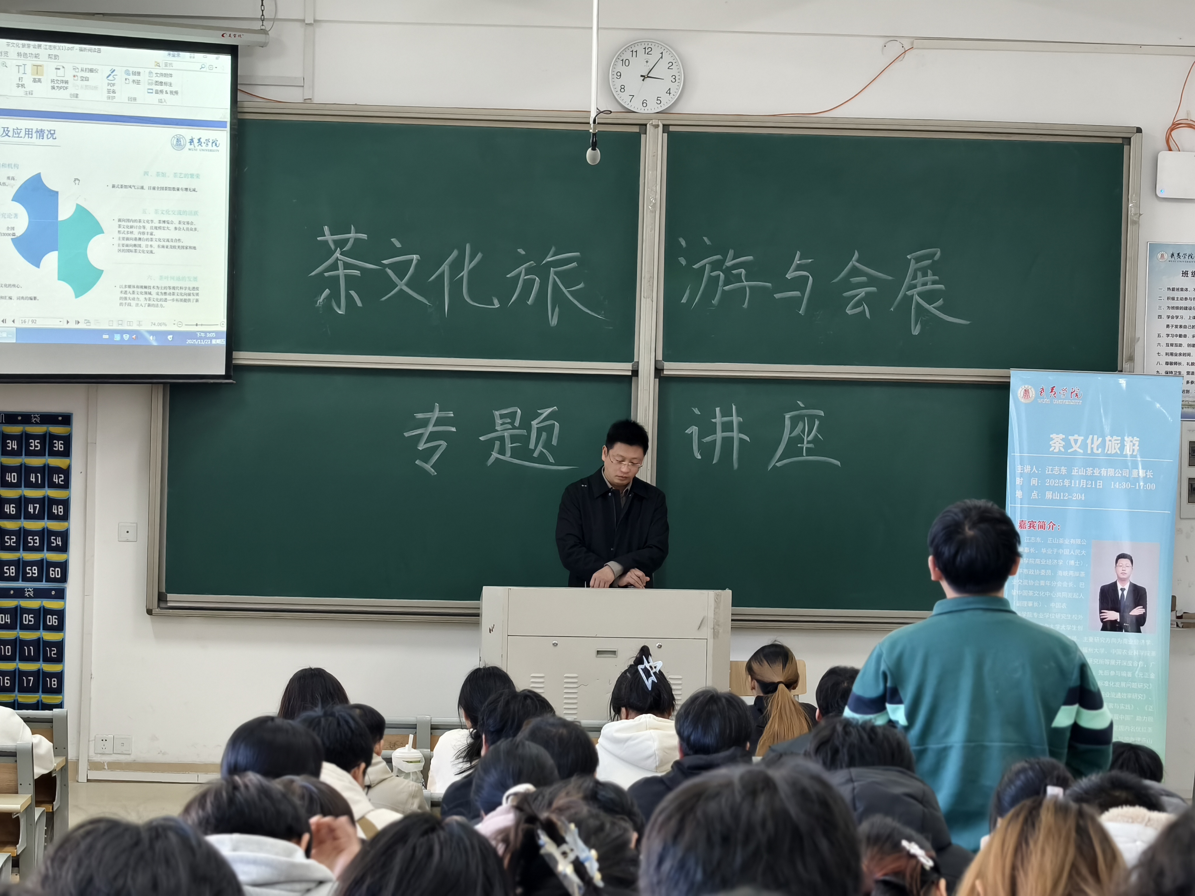 实习收官之日,同学们应邀参观了武夷星茶业展馆,了解了武夷星茶旅特色,与茶企人员亲切互动。正山堂茶业的董事长江志东先生为同学们带来专题分享,以其丰富的行业实践经验,帮助同学们将连日来的实地调研收获升华为系统的产业认知,为实习画上圆满句号。