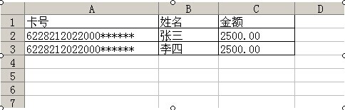 为了能更加快速、高效的进行银行代发工资打卡,使教师、学生的代发打卡金额能够及时准确到账,特统一规定代发工资打卡格式,望全体教师能够积极配合。谢谢! 具体格式要求如下: ① ②请教师到财务网页下载专区下载学生打卡模板,并将信息填入模板内。 ③制作完成的电子表格标准格式如下: