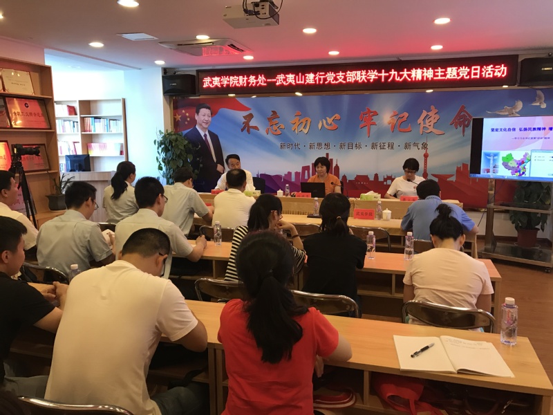 为深入贯彻党的十九大精神,扎实推进“两学一做”学习教育常态化制度化,严格落实“三会一课”。5月24日下午,财务处党支部书记龚文华处长带领全体党员、团员前往武夷山市建设银行,与建行党支部共同开展“支部好党课”主题联学活动。