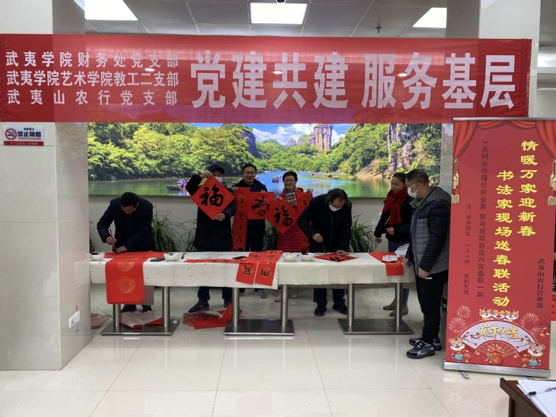 1月21日上午,我校财务处党支部、艺术学院教工第二党支部与武夷山农行党支部联合开展学习党的十九届六中全会精神、为党员过“政治生日”、书法家送春联等系列主题党日活动。