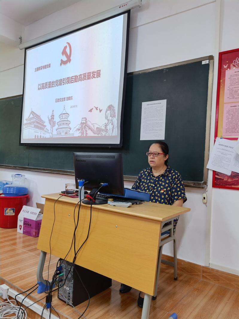 在全校深入开展学习贯彻习近平新时代中国特色社会主义思想主题教育之际,7月6日下午,后勤管理处党支部书记刘晓青在后勤管理处会议室以《以高质量的党建引领后勤高质量发展》为题,为后勤管理处全体党员讲授专题党课。