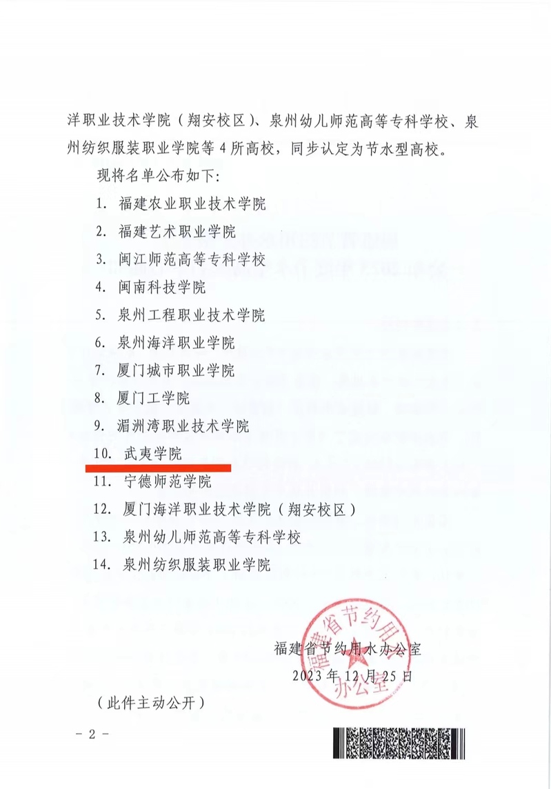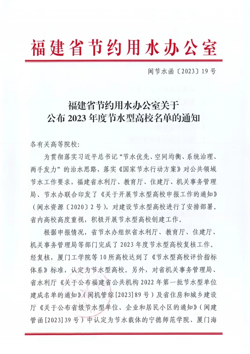 近日,福建省节约用水办公室发文公布了2023年度节水型高校名单。因节水工作突出、节水成效显著,我校获评福建省节水型高校。