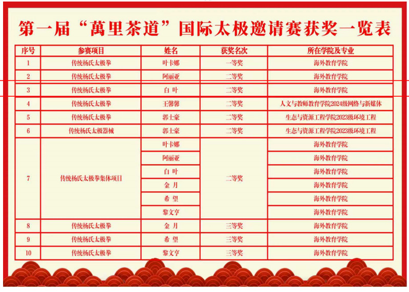 本次赛事不仅是一次体育竞技的盛会,更是太极拳、武夷茶文化及朱子理学“和合”智慧的深度融合与展示。我院来华留学生的积极参与和优异表现充分展现了我院在中华优秀传统文化国际传播与教育方面的丰硕成果,也进一步推动了我校与“万里茶道”沿线国家和地区的文化交流。