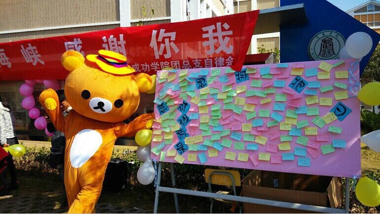 本次感恩拥抱日活动分为两个阶段:第一阶段为感恩便利贴与拥抱环节。活动现场中,紫色展板周围缤纷气球环绕其间,一颗颗气球绘成爱心,这是我们心中祈望,横幅轻飘,这是少年们扬帆拥抱的步履。今天这里有专门为参与者准备的便利贴,他们可以抛弃尾随的羞涩,在上面写上心中的话语,并诚心邀请参与者一起拥抱光明熊,他的温暖的怀抱是否也感染了你?路人们感受到我们感恩的热潮,纷纷驻步,在便利贴上绘出心中所感、心中所爱。光明熊,在提供我们欢愉之余,给予我们温暖怀抱,告知我们感恩不是局限于思想,行动更是根本。 第二个阶段为“亮灯绘心”环节是继感恩便利贴与拥抱环节后的一大挑战。由于亮灯宿舍与熄灯宿舍不尽是学生宿舍,其中有无人宿舍更有外系教师宿舍,亮灯与熄灯的命令难以达成,这是本环节的一大挑战。活动进行前,自律会成员步步为营与各个宿舍做好沟通工作,由宿舍长做好各自宿舍灯光调节工作;活动进行时,自律会干部临阵指挥,自律会大一成员全员恪尽职守,时刻关注着对应负责的宿舍,当命令传达时,力求做到分毫不差。