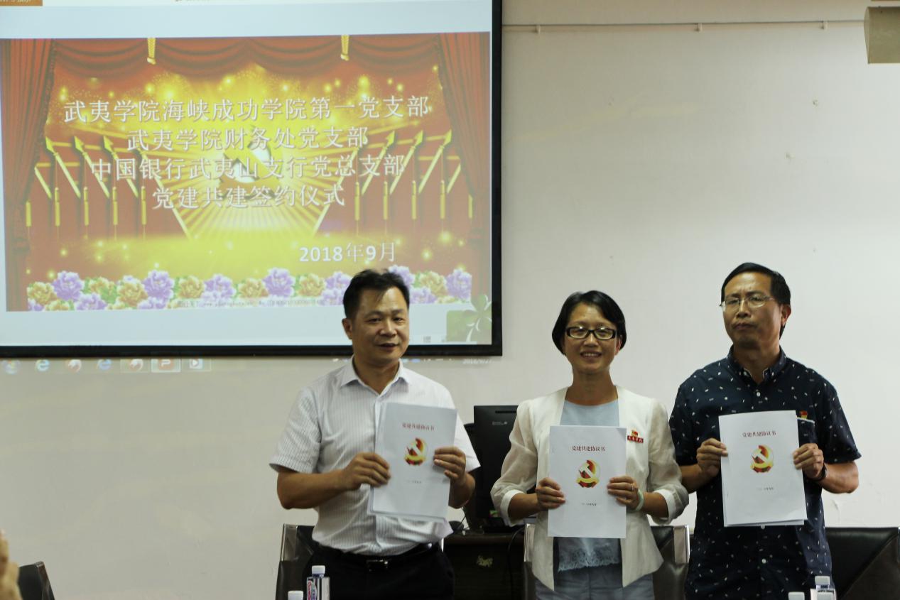 首先,武夷学院海峡成功学院第一党支部、武夷学院财务处党支部、中国银行武夷山支行党总支部进行党建共建签约仪式,以更好促进各支部之间相互交流学习。跨部门、跨行业开展支部共建与主题党日活动,能够有力地促进优势互补、比学相长,也是把实习落到实处、提升理论学习效果与业务能力的有效途径。三方约定将定期开展交流与党建的共建工作,每年七一前共商下一年的党建工作计划。