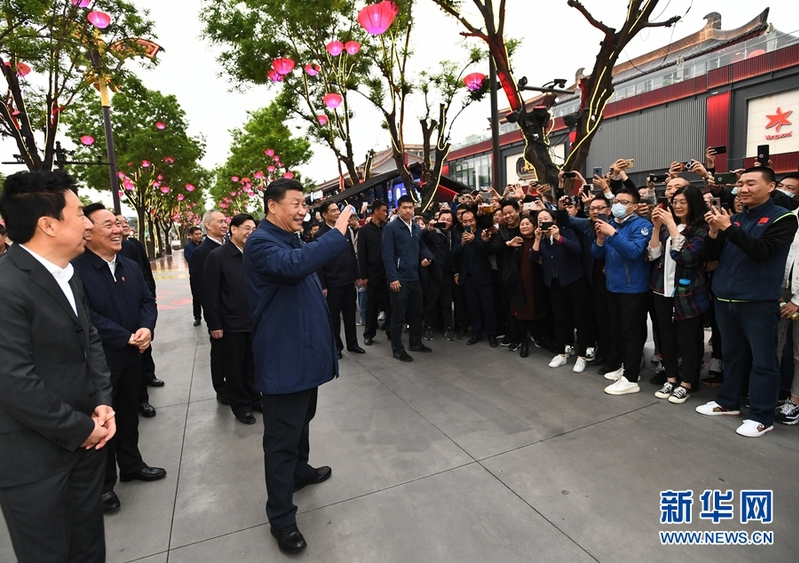 4月20日至23日,中共中央总书记、国家主席、中央军委主席习近平在陕西考察。这是4月22日,习近平在西安大唐不夜城步行街考察时,向游客挥手致意。 新华社记者 谢环驰 摄