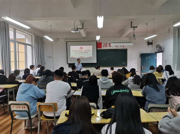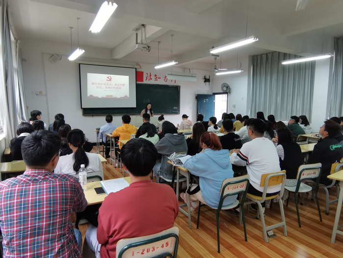 肖燕玲老师传达了校党委肖铮书记在学校党史教育动员大会上的讲话精神。用身边的发展成就阐释了我们党团结带领人民造就了中华文明新的历史辉煌。她倡议广大青年大学生要自觉学习党史、新中国史、改革开放史、社会主义发展史,做到知史爱党、知史爱国,在党史的学习领悟中坚定理想信念,在奋发有为中践行初心使命。