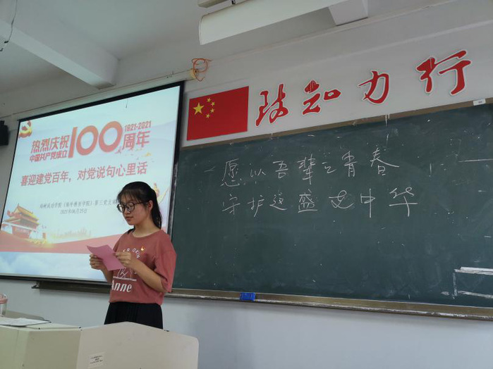 会上,2018级视觉传达设计班米蕾说到“党之伟业当千古,当不朽,初心不改,盛世可期”;2019级电子信息工程班的薛星慧同志说到:“一百年实践证明,中国共产党是伟大的党,身为一名共产党员,我由衷的感自豪和骄傲,感谢党多年的信任和培养,我也必将不负期望,践行党旗下的誓言”,紧接着,其余党员同志们纷纷用真挚的情感、质朴的语言表达了对党的热爱和对祖国美好未来的祝福,也为一百年来中国共产党领导人民取得的辉煌成就感到骄傲和自豪。
