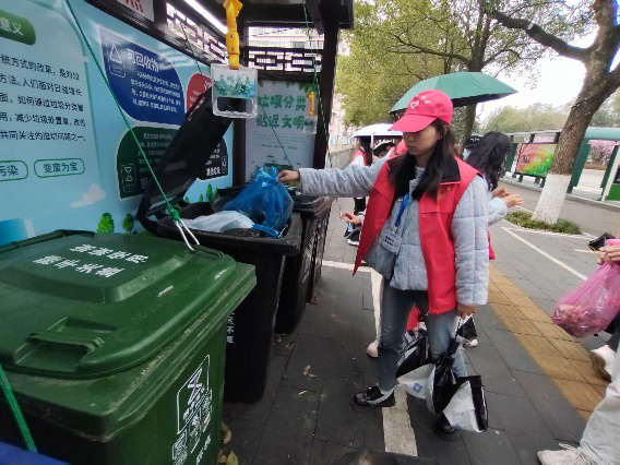 之后,志愿者们的拎着满当当的垃圾环保袋前往垃圾分类点,进行垃圾分类。