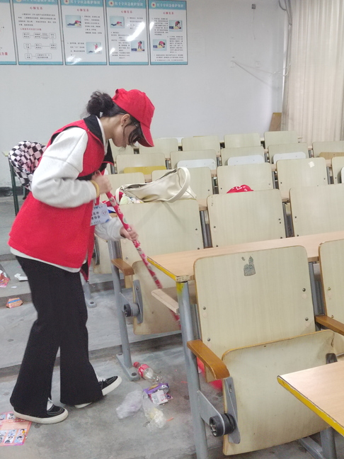 活动中,志愿者们分成三队,打扫同文四教学楼的阶梯教室。志愿者在教室里,清扫桌椅旁的垃圾,擦拭窗户、黑板等。认真将大家的学习环境打扫得干净有序、整洁明亮,同时志愿者也将教室后面的垃圾边角整理干净,清洁工具排放整齐。