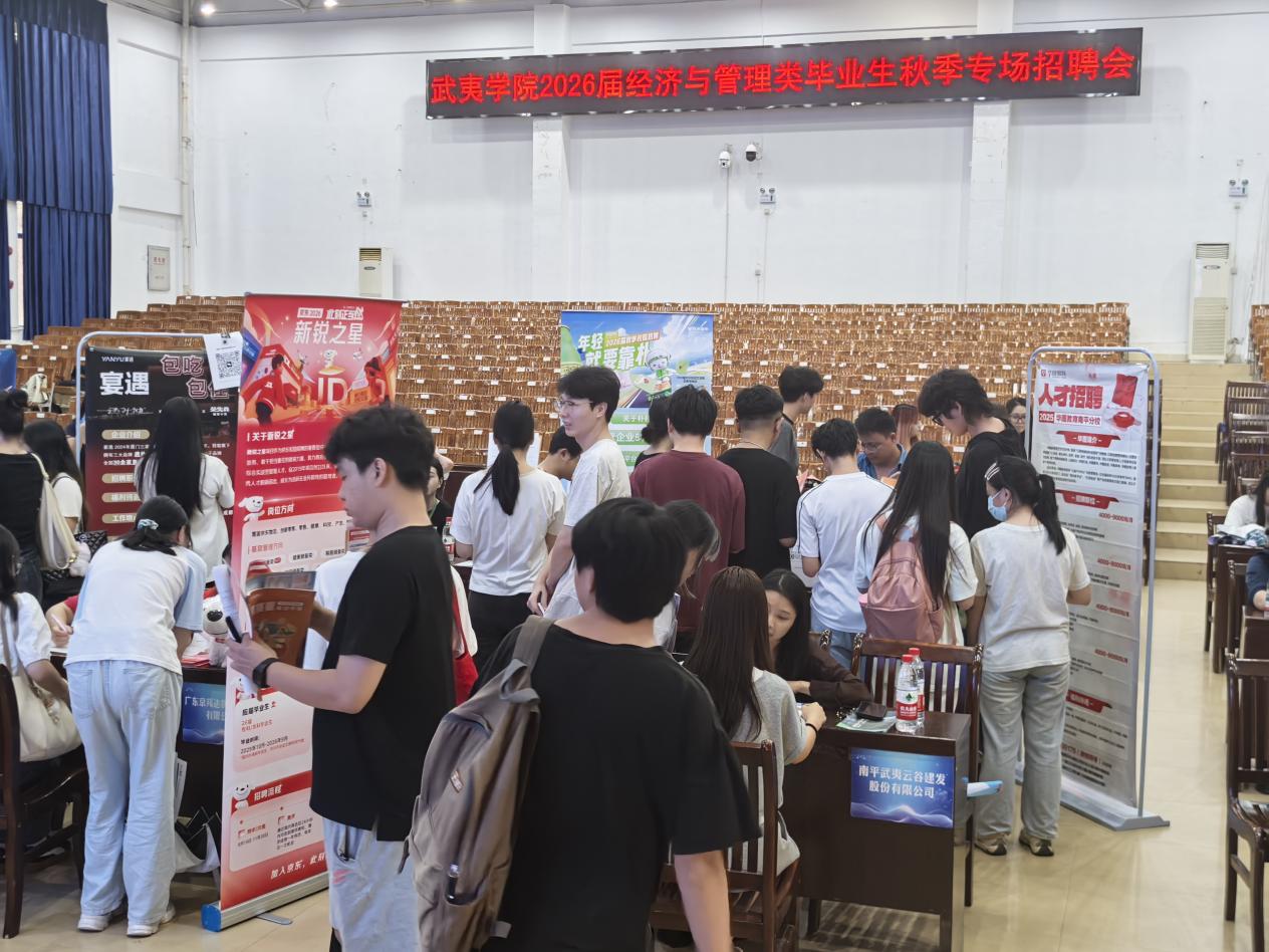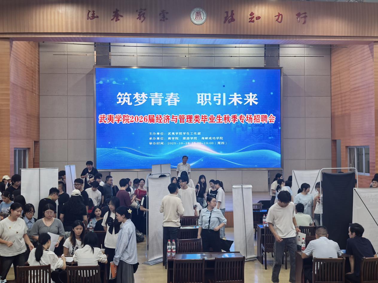 10月16日下午,由商学院、旅游学院和海峡成功学院联合承办的2026届经济与管理类毕业生秋季专场招聘会在武夷学院同文报告厅顺利举行。