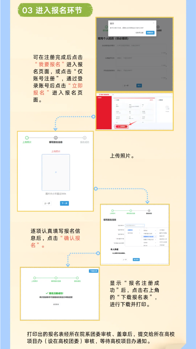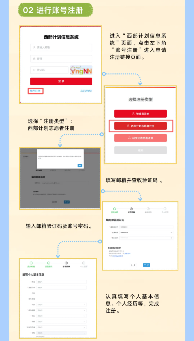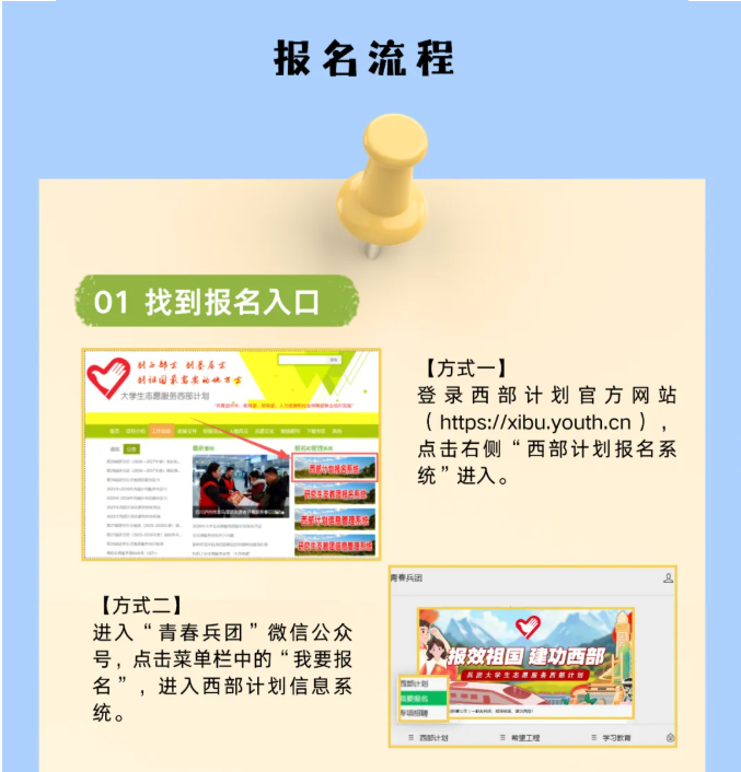 3月1日起至5月10日,2026年普通高等学校应届毕业生或在读研究生, 可登录西部计划官方网站(https://xibu.youth.cn)或通过“西部志愿汇”微信公众号 (菜单栏中的“我要报名”),在西部计划信息系统(https://west.youth.cn/login)中完成注报名。