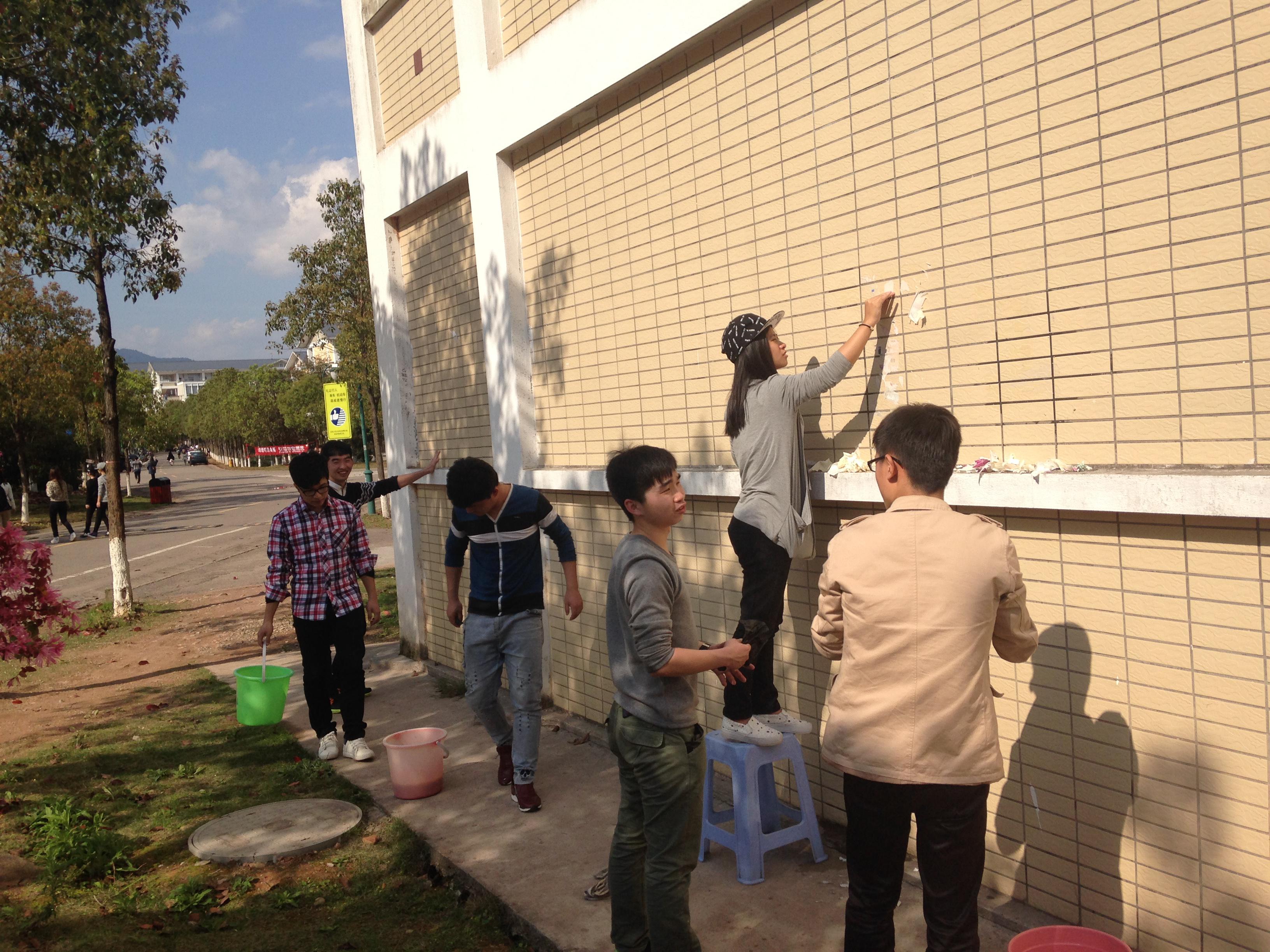 文明校园,你我共建。2015年3月27日下午2点半,13机械3班的20多个志愿者在团支书黄银坤的带领下对瑞樟宿舍楼前的小广告进行了清理活动。首先团支书黄银坤召集志愿参加这次清理小广告活动的20多个同学在瑞5-103作了活动动员及活动安排。接着黄银坤将同学们分成四组,明确各自工作区域、任务分工及活动准备。下午活动开始,黄银坤带领同学们带着刷子及水桶来到瑞樟宿舍楼前,进行清理活动。经过反复清理多次才将墙上的小广告清理干净。同学们由此深切感受到随意张贴小广告对清洁工作带来的负担。经过同学们近两个小时的努力,瑞樟宿舍楼前花花绿绿的小广告得到了有效的清理,校园重获新颜。同学们清理活动结束后宿舍楼前合影纪念今天有意义的活动。
